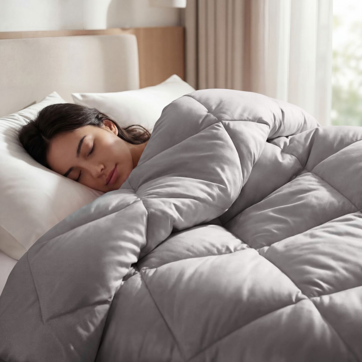 Благодаря объемному наполнителю одеяло обволакивает приятной тяжестью, создавая эффект антистресс-объятий, тем самым помогая полноценно расслабиться и быстрее заснуть.