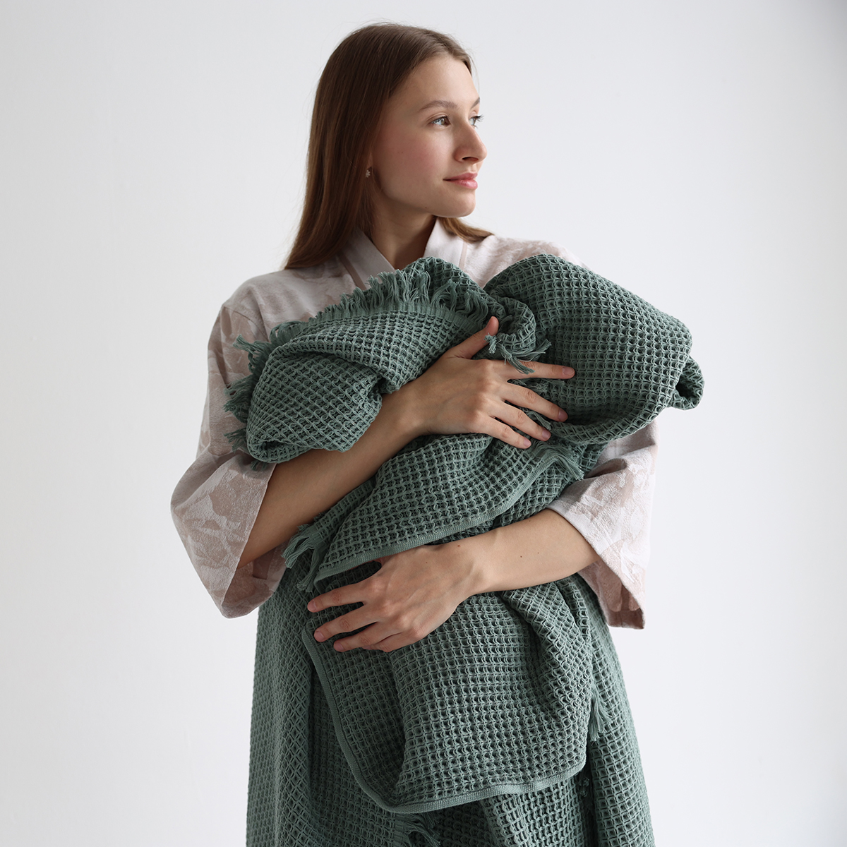 Высококачественная натуральная пряжа делает плед мягким и комфортным на ощупь. Оригинальная объемная фактура добавляет особую изысканность пледу.
