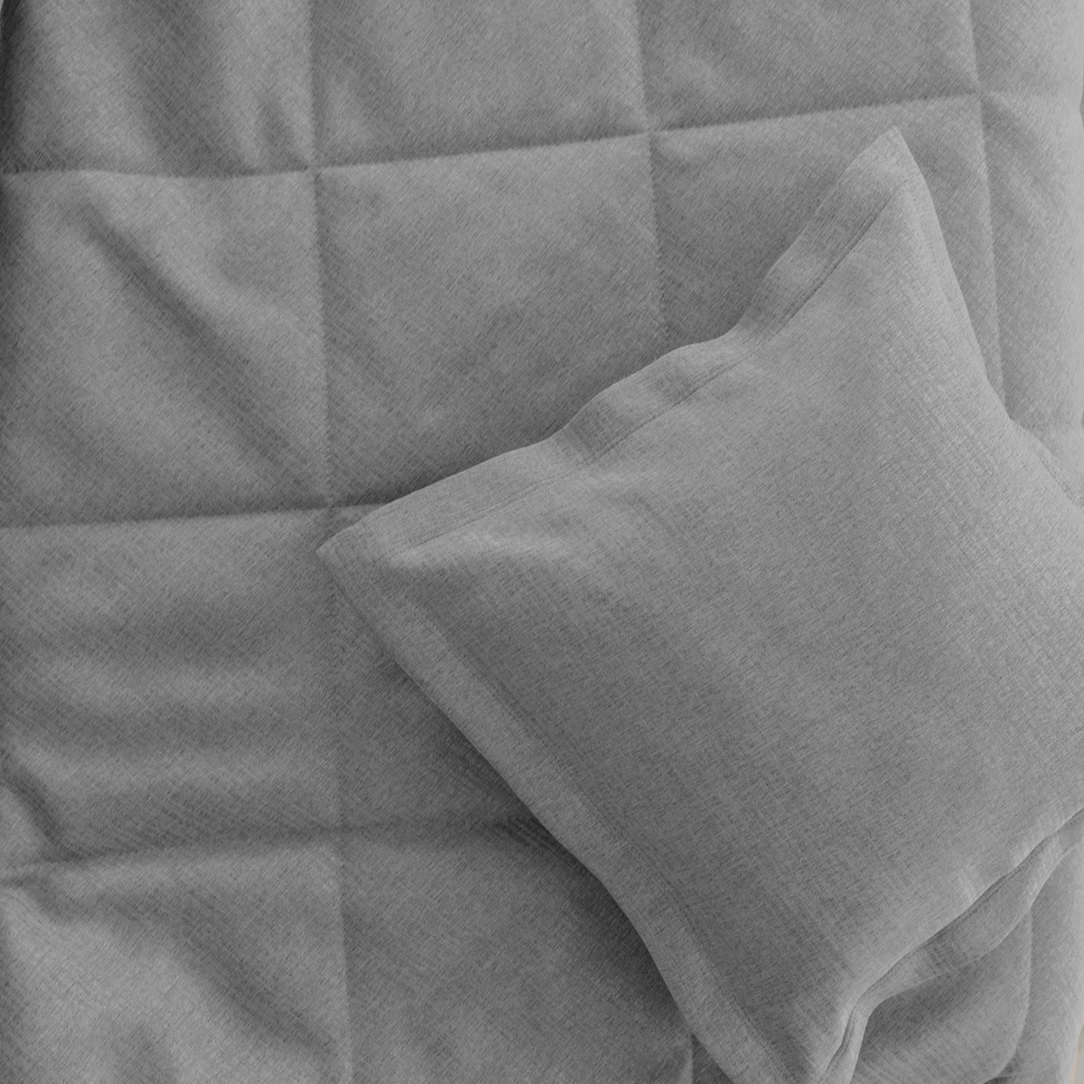 В комплект входит: стеганое покрывало на подкладе размер 220х240 см и 2 декоративные наволочки 45х45 см на молнии. Наволочки с четырех сторон декорированы ушками шириной 4 см.