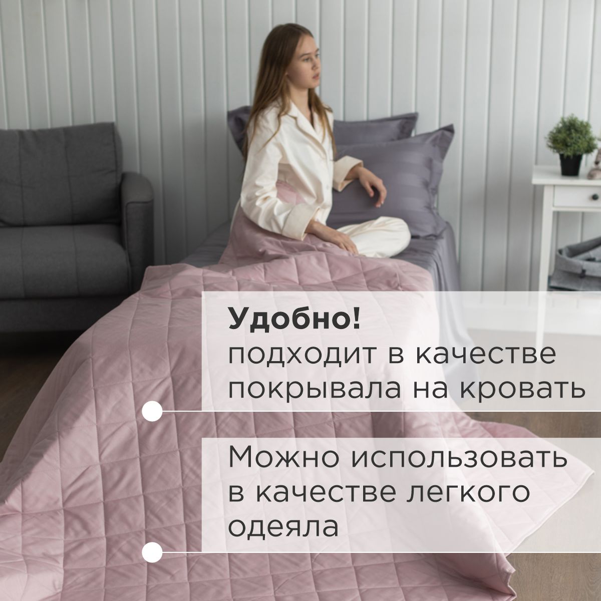 Покрывало на кровать многофункционально: стильно украсит кровать, а также благодаря тонкому слою наполнителя его можно использовать как легкое одеяло.