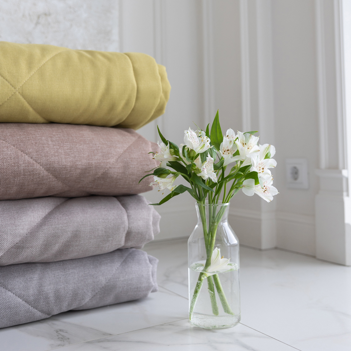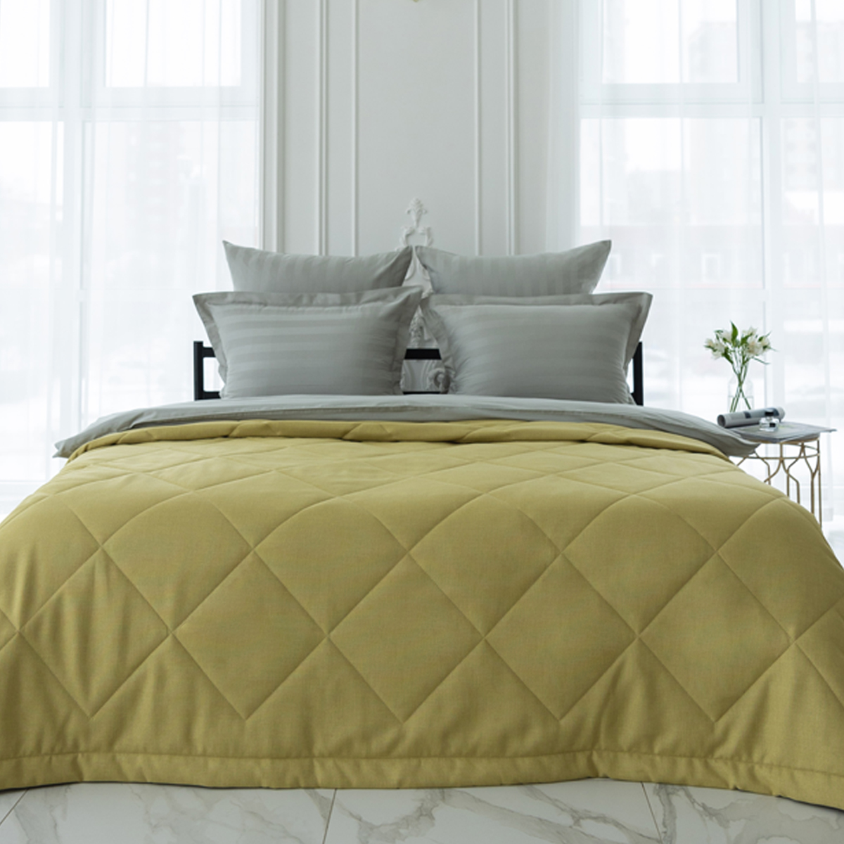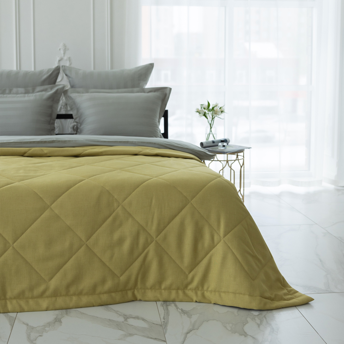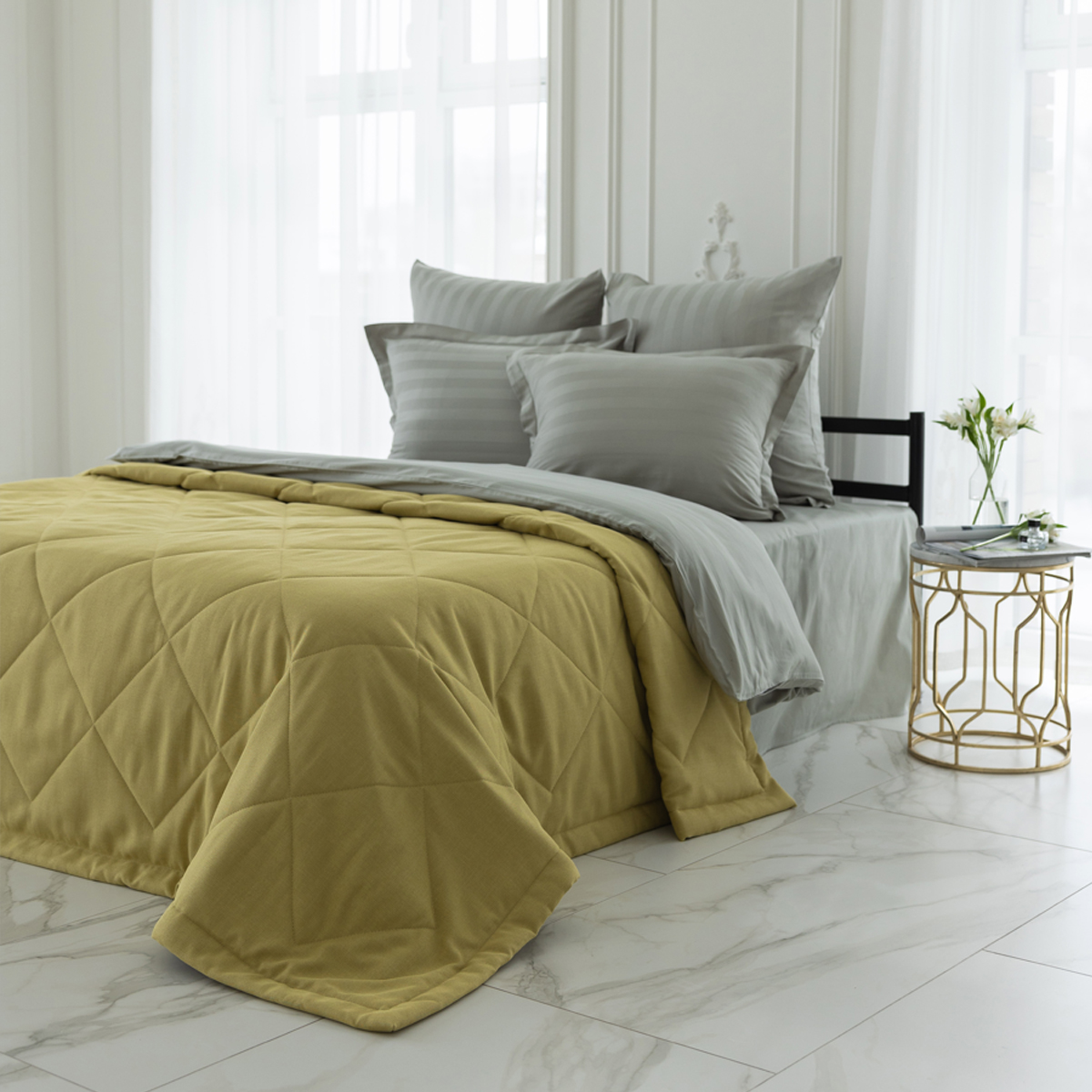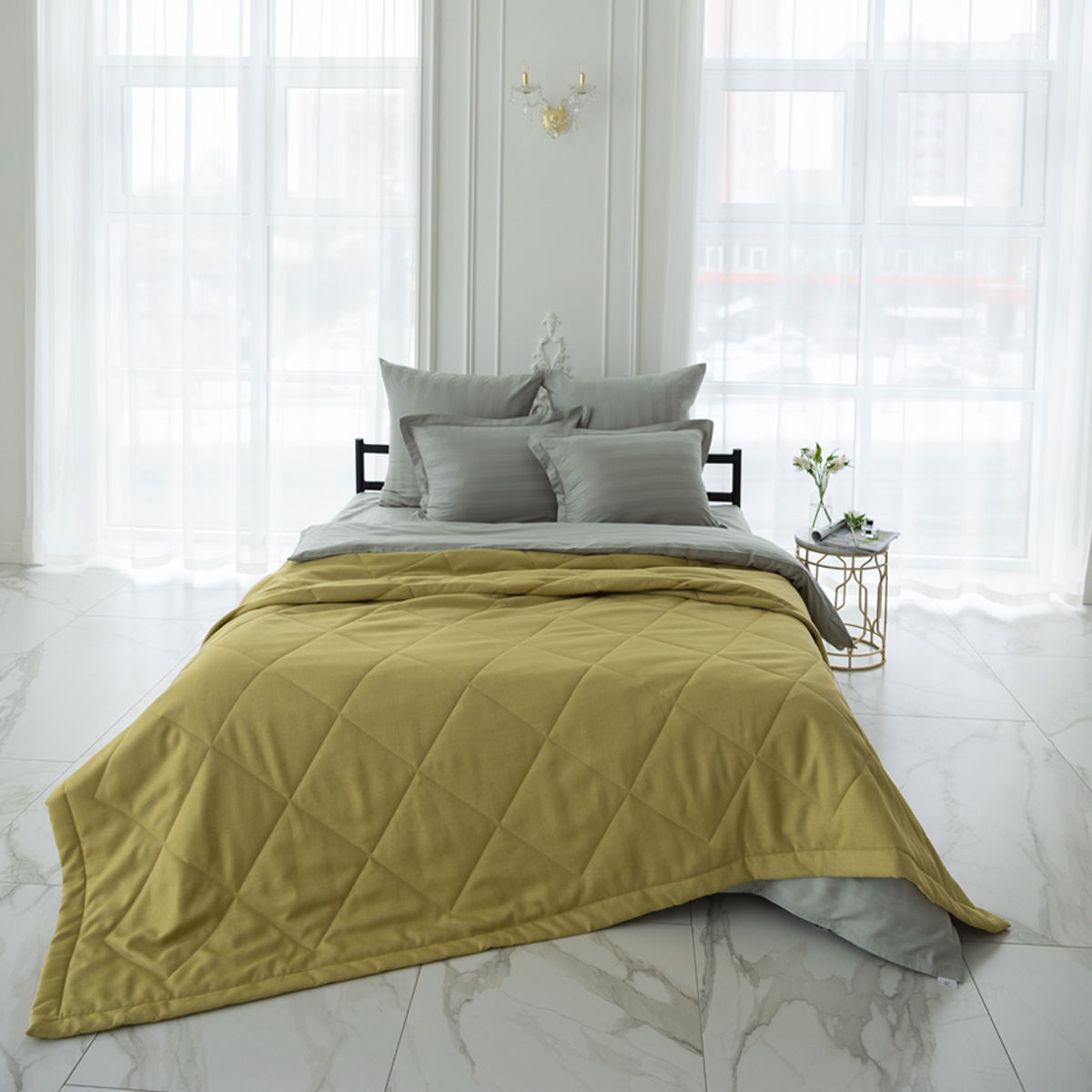 За покрывалом очень легко ухаживать, его можно стирать в домашних условиях при температуре 30С. Покрывало на кровать отлично держит форму и не дает усадку.