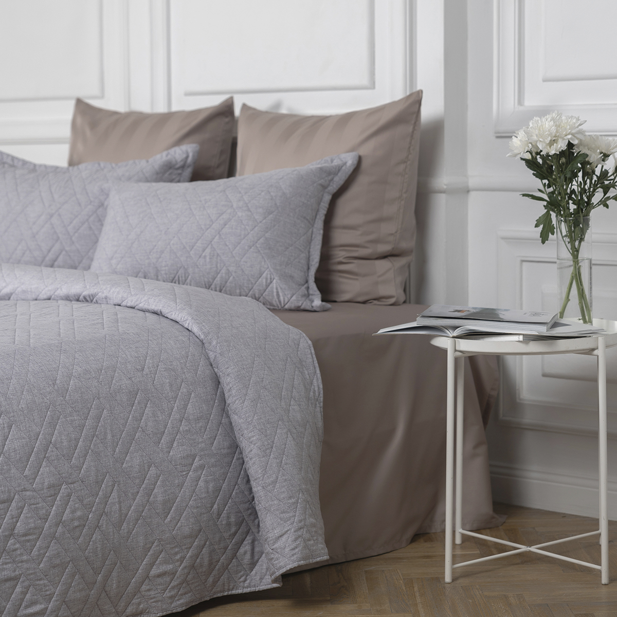 В комплект входит: покрывало на кровать 220x240 см и декоративные стеганые наволочки 50x70 см с ушками – 2шт. Состав: 60% вискозы и 40% хлопка, обеспечивает нежное прикосновение и комфортный сон. Покрывало имеет тактильно приятную Soft Touch фактуру и матовую поверхность для максимального комфорта. Не скользит, идеально принимает форму кровати.