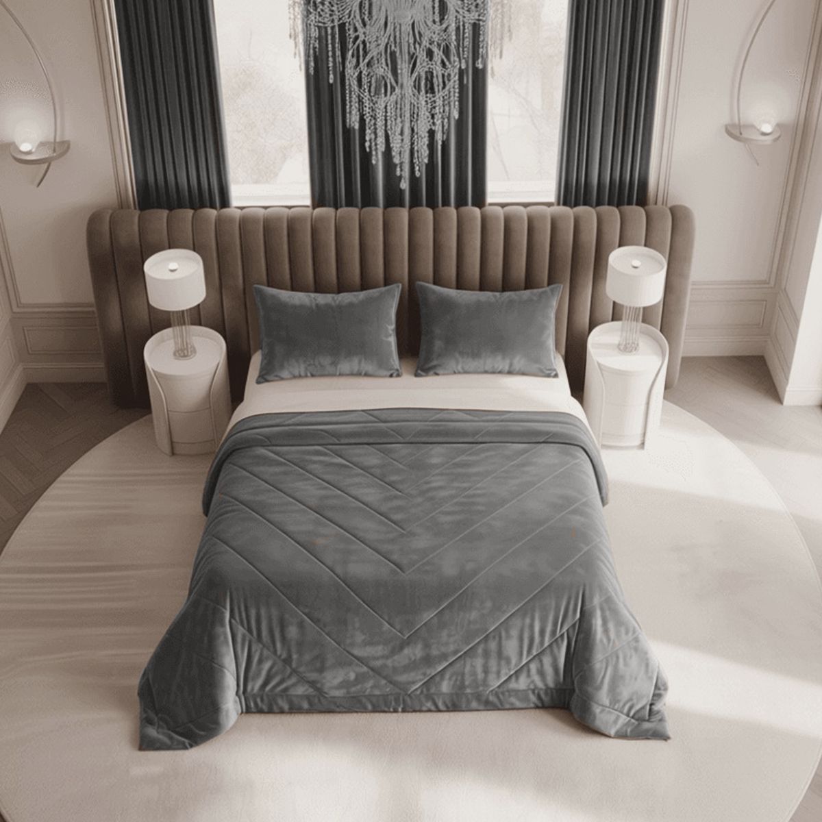 Покрывало создаёт атмосферу спокойной уверенности и выглядит дорого без лишней пафосности.