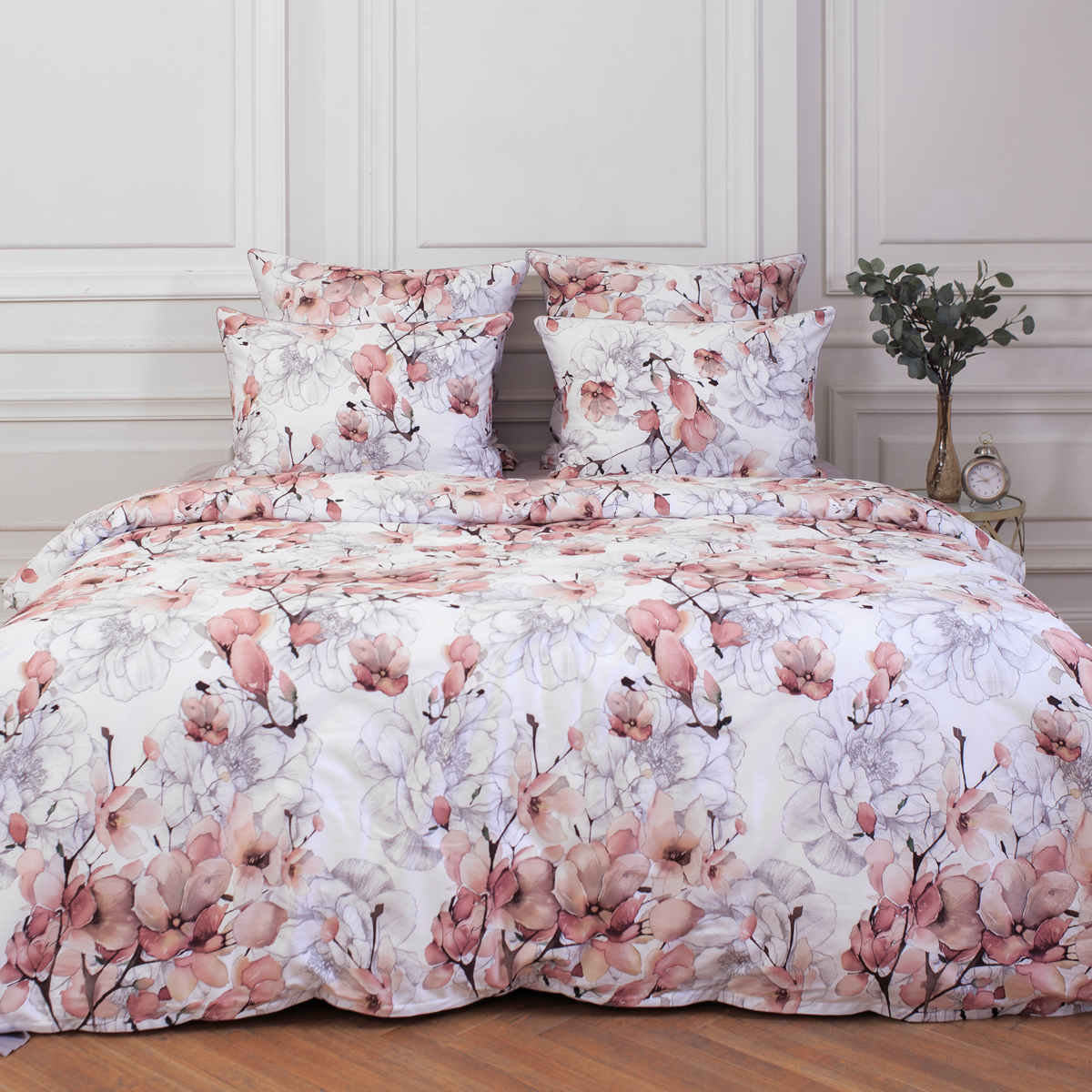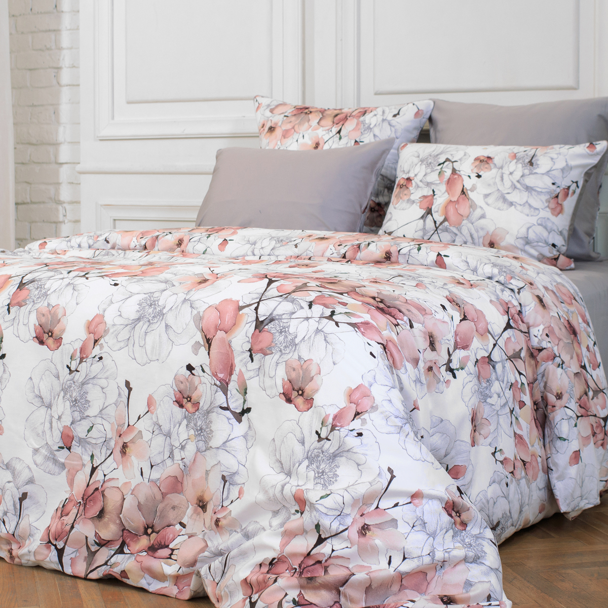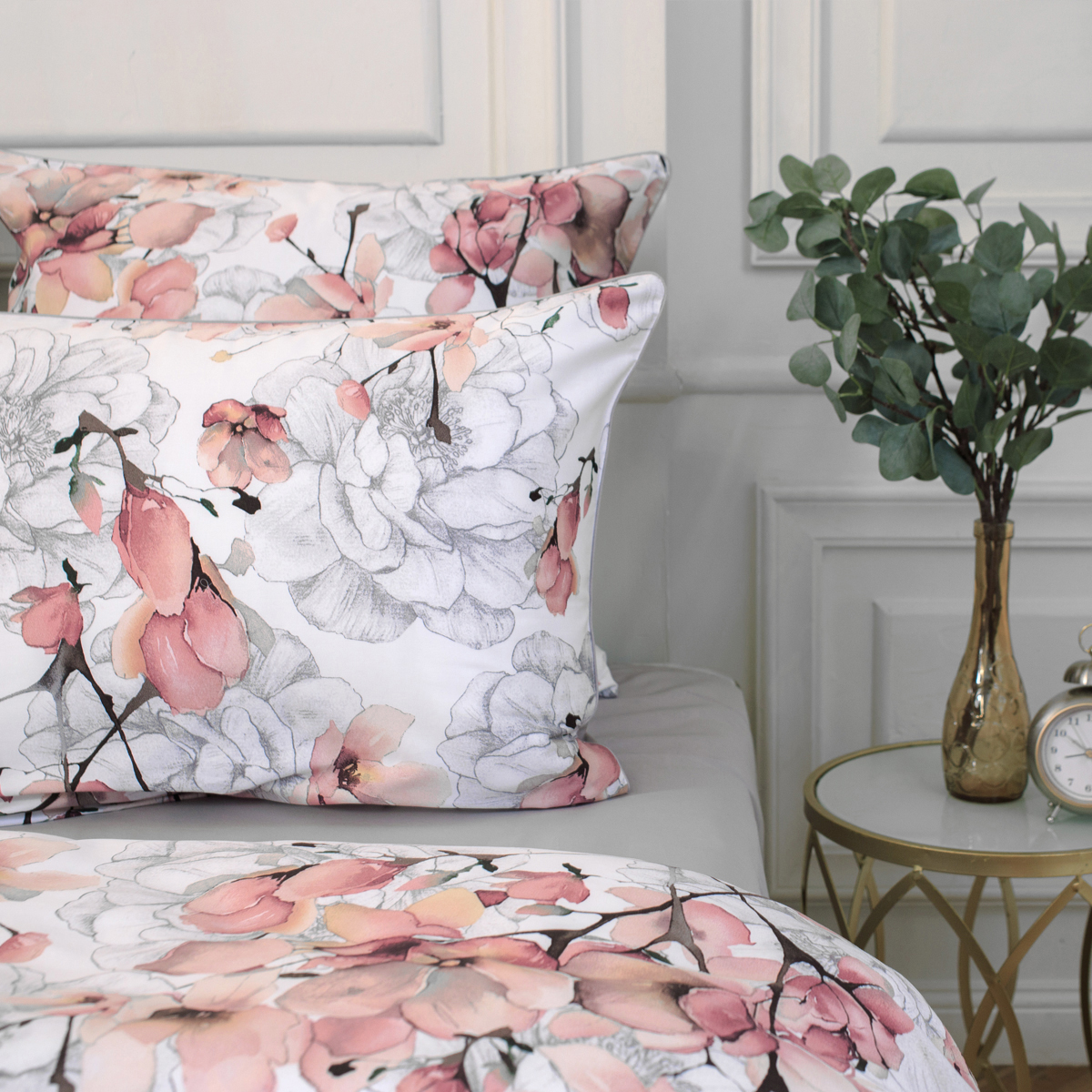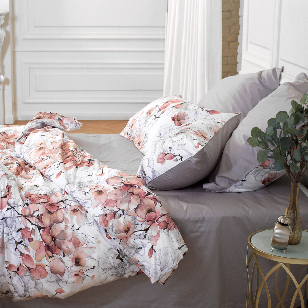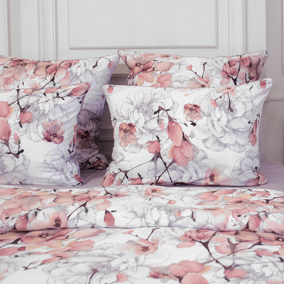 • Наволочки двухсторонние: лицевая сторона – цветочный принт, оборотная – однотонная. Декоративный кант по трем сторонам наволочки.