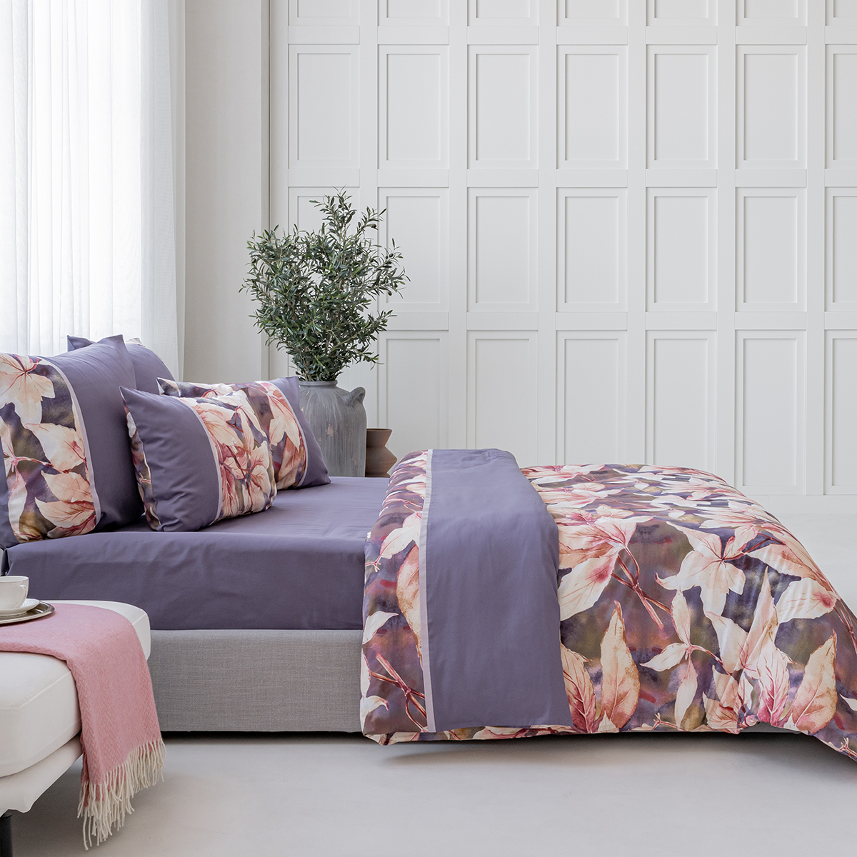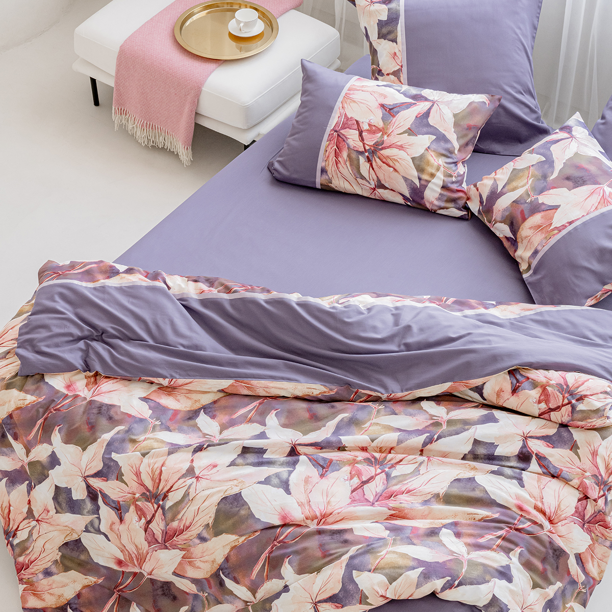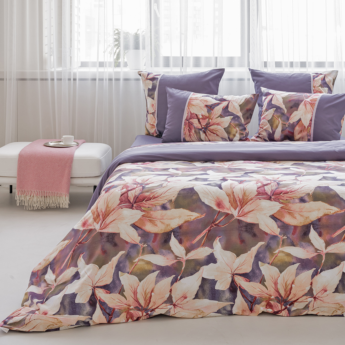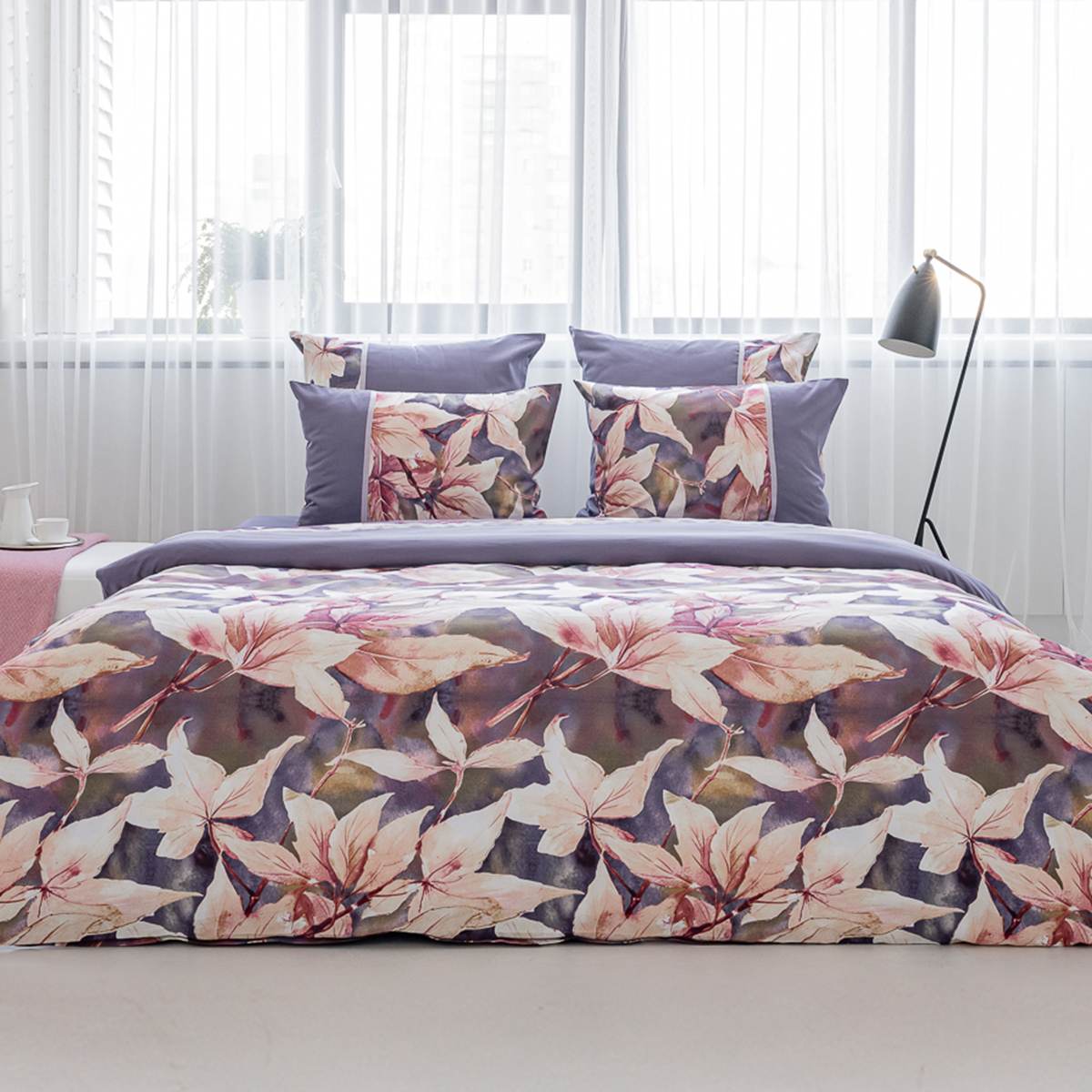 Создавая принт постельного белья Жаклин, дизайнеры вдохновились удивительными природными мотивами. В оригинальном растительном принте комплекта соединились глубокая и сложная гамма оттенков от насыщенного фиолетового до нежно лилового. Смещение красок создает на ткани невероятные переливы.