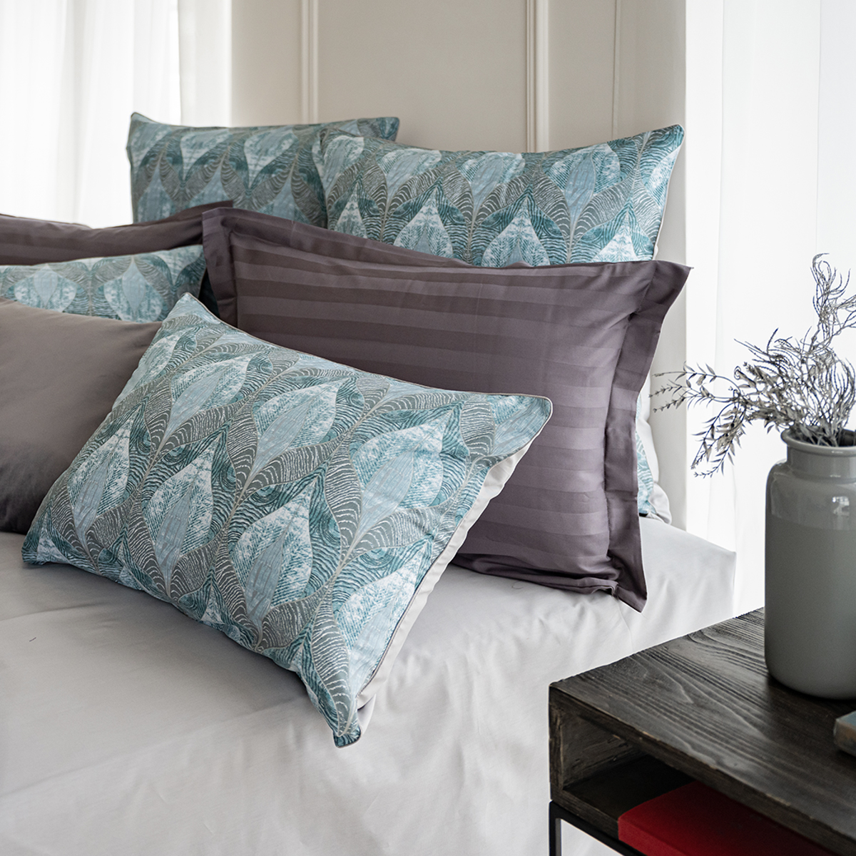 - Наволочки двухсторонние: лицевая сторона– этнический принт, оборотная – однотонная. Декоративный кант по трем сторонам наволочки.