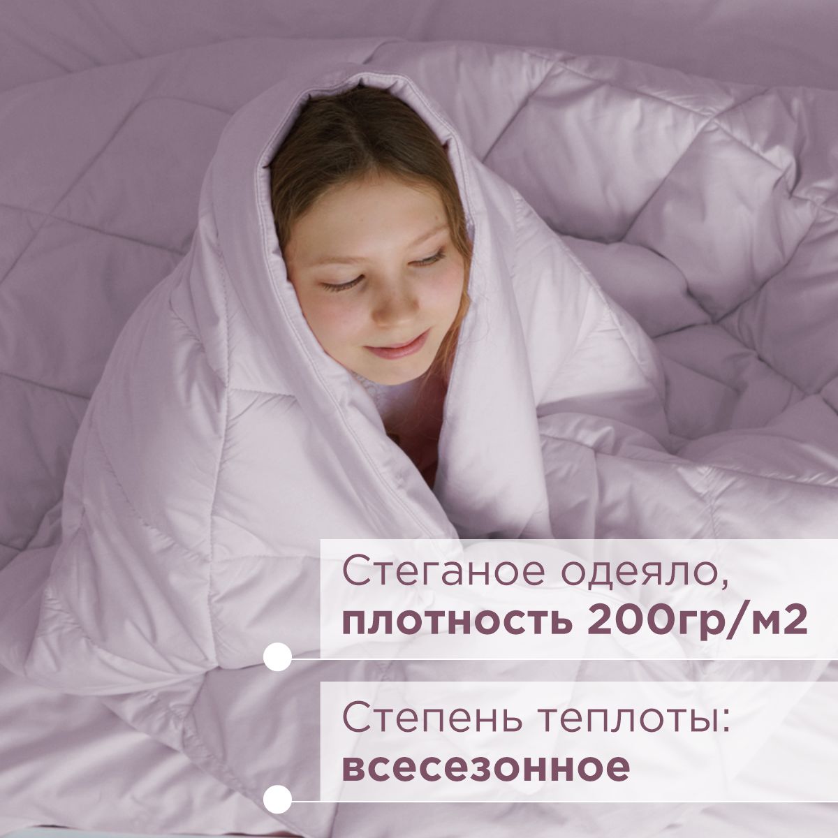 - Стеганое одеяло 140х205см. Одеяло всесезонное, плотность 200гр, что позволяет пользоваться им круглый год. Наполнитель у одеяла: гипоаллергенное 3D микроволокно, не сбивается после стирок.