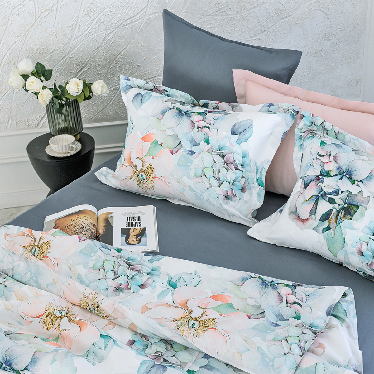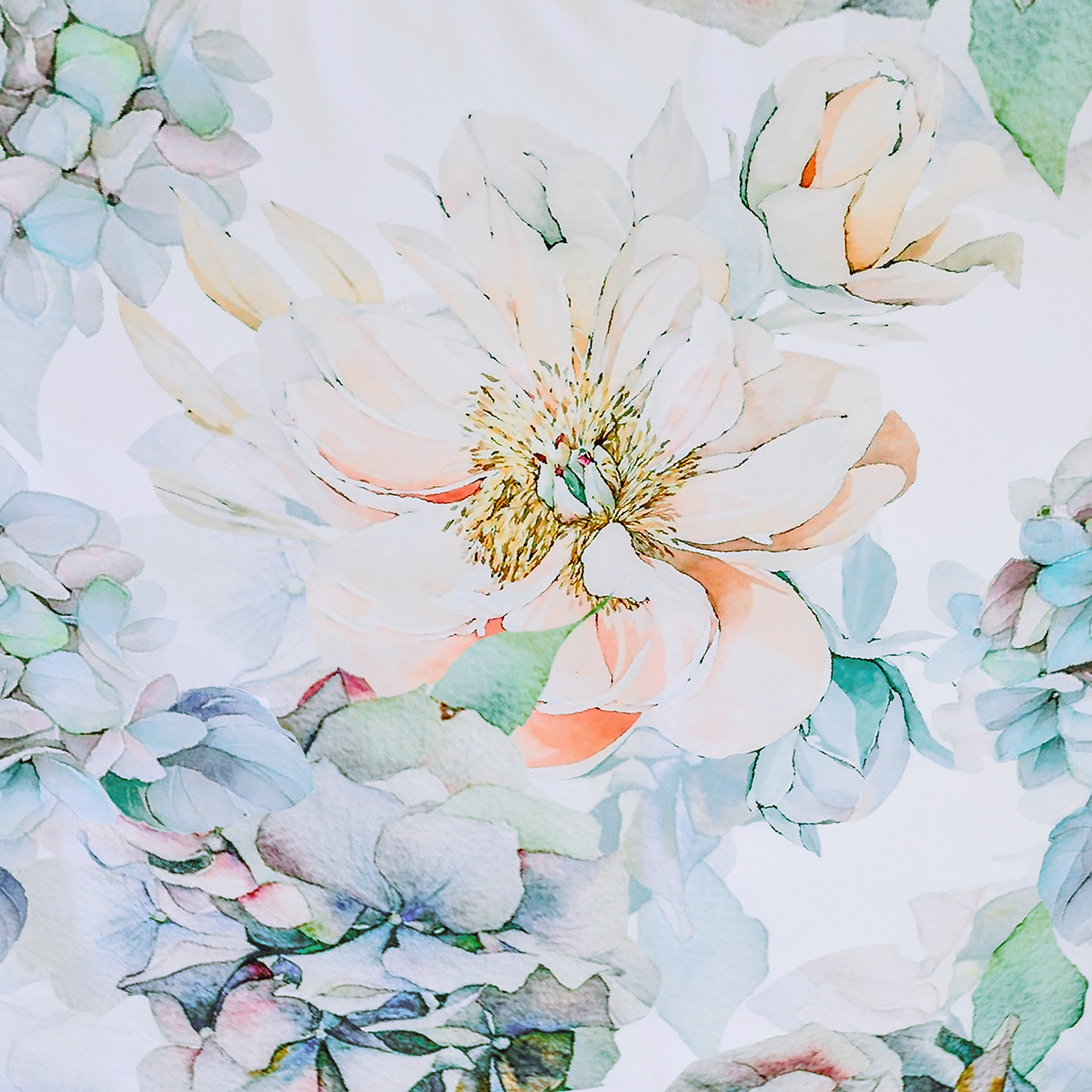 Роскошная гортензия, выполненная в акварельной технике, притягивает взгляд. Удивительно нежные соцветия, выполненные в мягких голубых оттенках на белоснежном фоне, составляют прекрасный образ сада, наполненного ароматами душистых цветов.