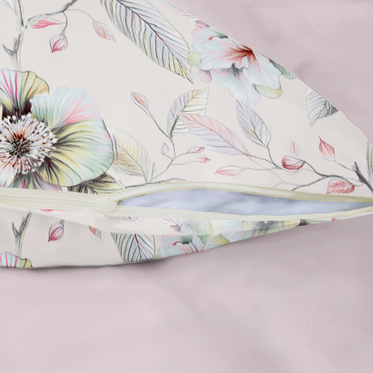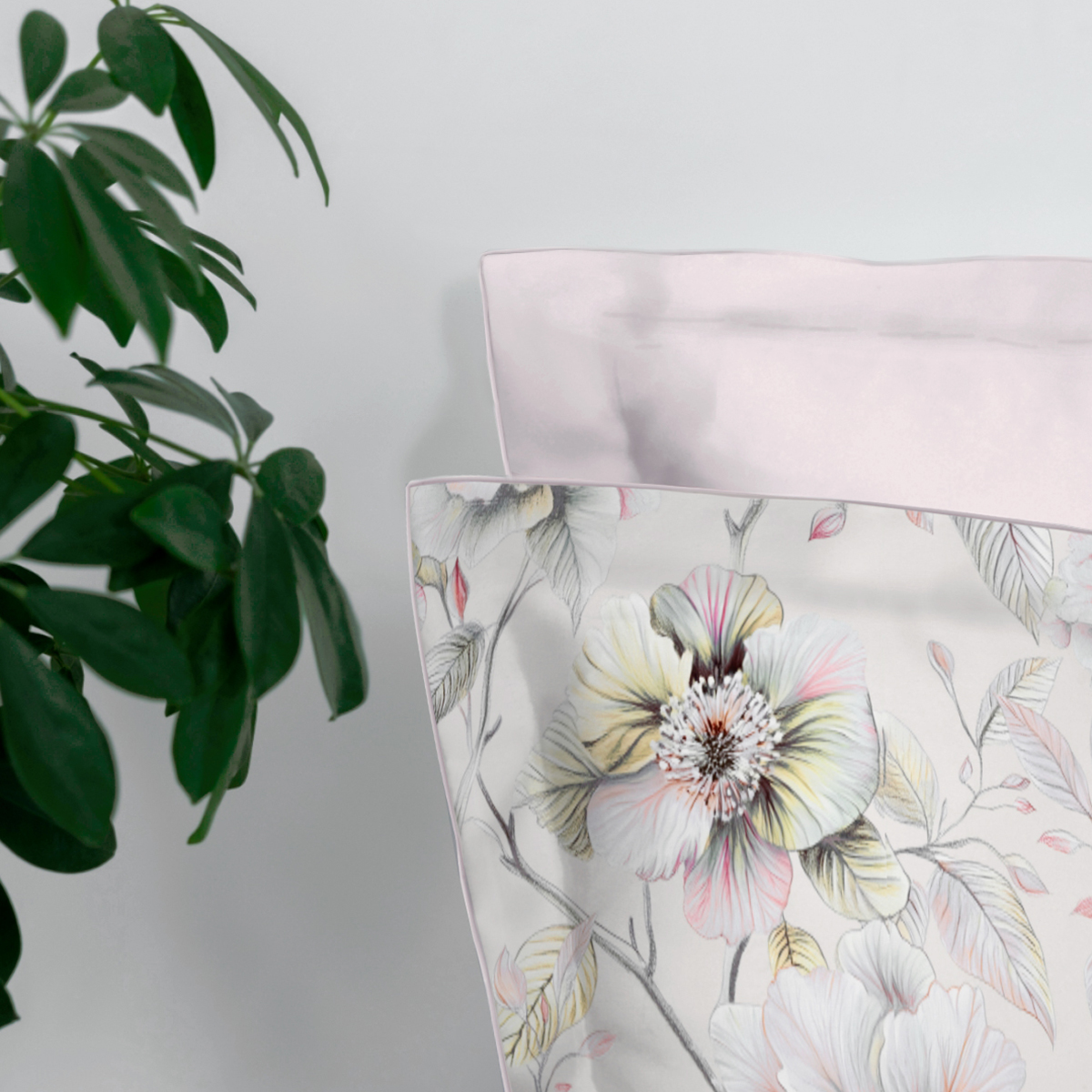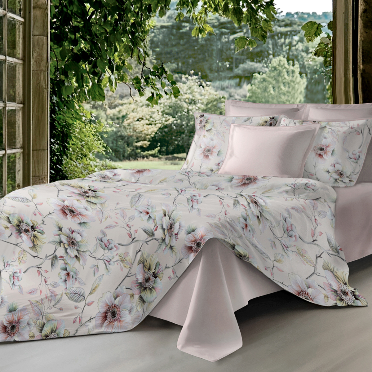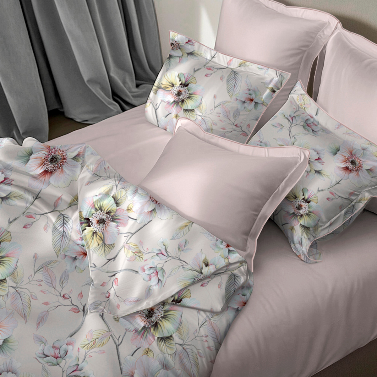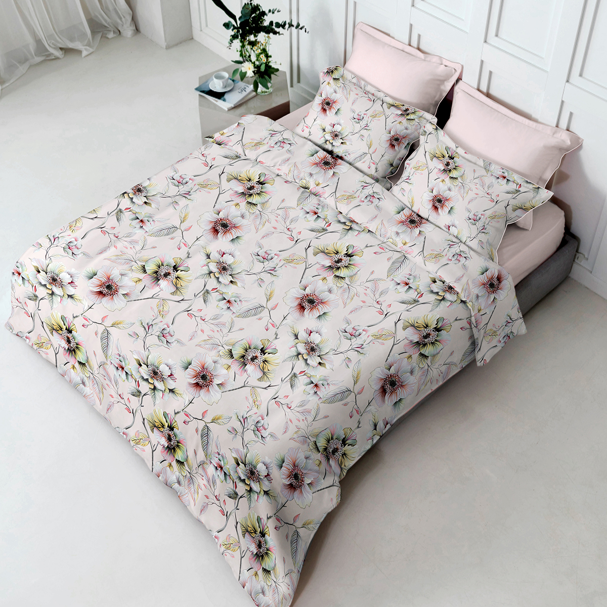 Сильвана. Постельное бельё словно соткано из утреннего света и тонких акварельных грёз. Фон — мягкий, как сливочный шёлк, становится идеальным полотном для нежных, почти воздушных соцветий. Ощущение свежести, лёгкости и безмятежности, превращает спальню в оазис утончённой гармонии.