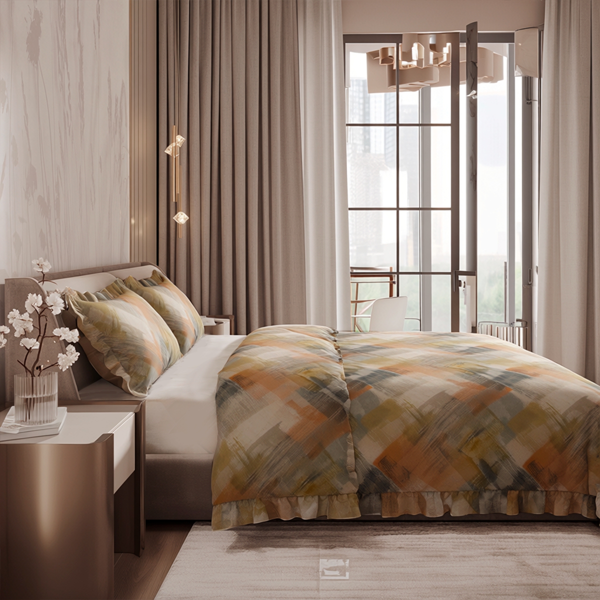 «Флоренсио»: Абстрактный принт, будто нарисованный широкой кистью. Сочетание оранжевого, серого, желто-зеленого и бежевого — это картина для вашей спальни. Энергичный, творческий, вдохновляющий на пробуждение.