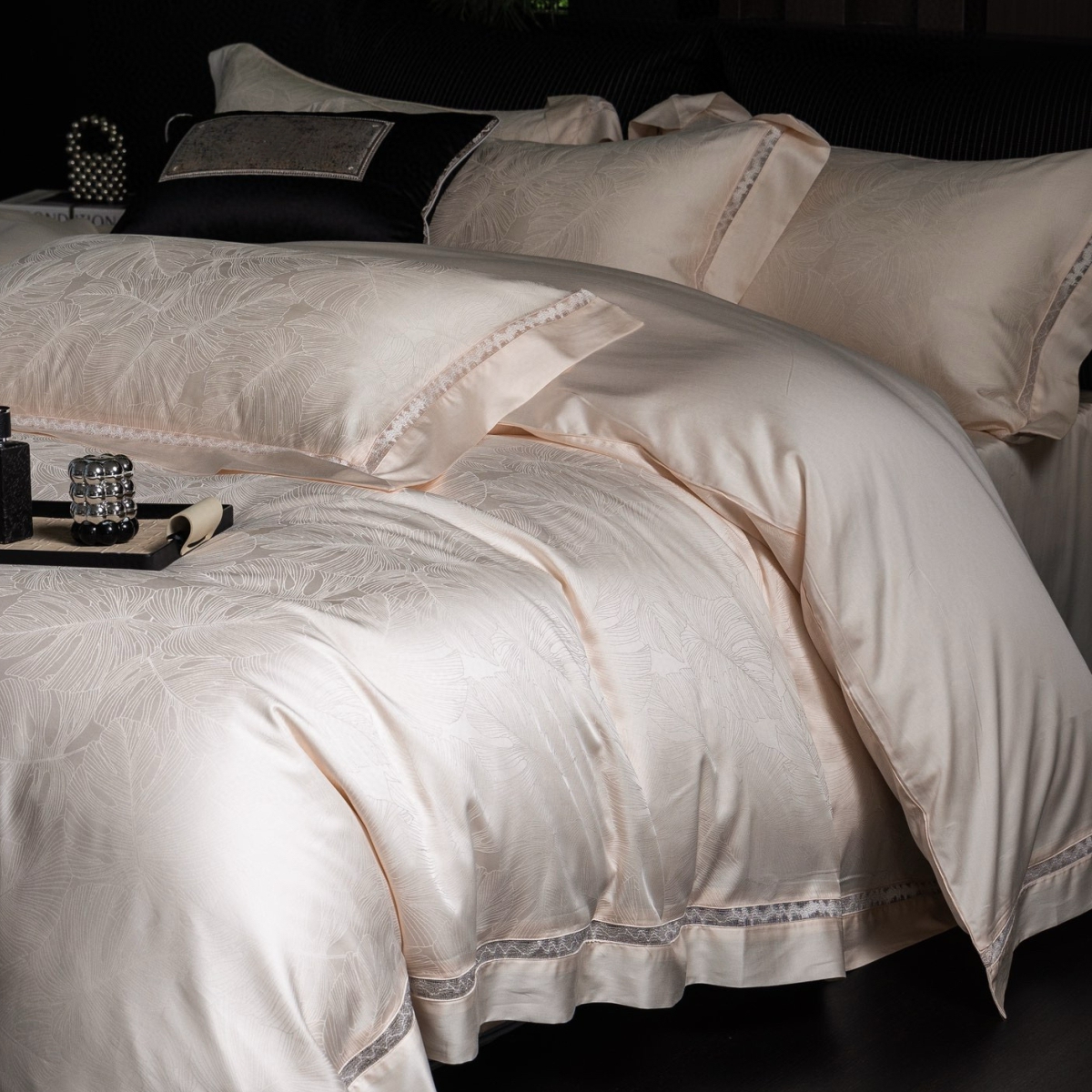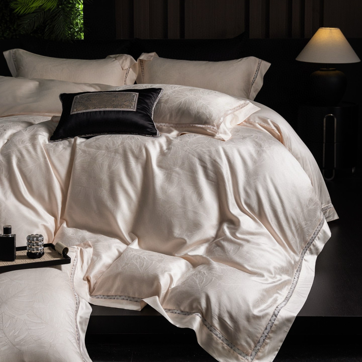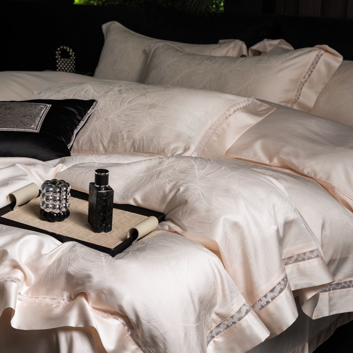 Кручёная нить придаёт материалу дополнительную прочность и создаёт эффект благородного сияния. Добавление шёлка усиливает тактильные ощущения: ткань остаётся прохладной на ощупь, но тёплой в объятиях, а её уникальная способность подстраиваться под тело делает отдых особенно комфортным.