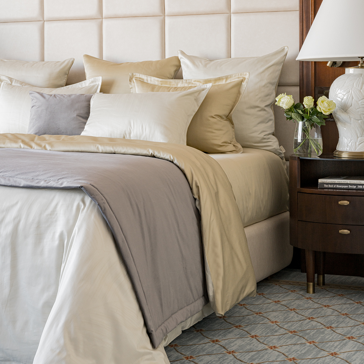 - Лицевая сторона наволочек и пододеяльника выполнена из жаккардовой ткани, оборотная из премиального длинноволокнистого хлопка сорта Пима