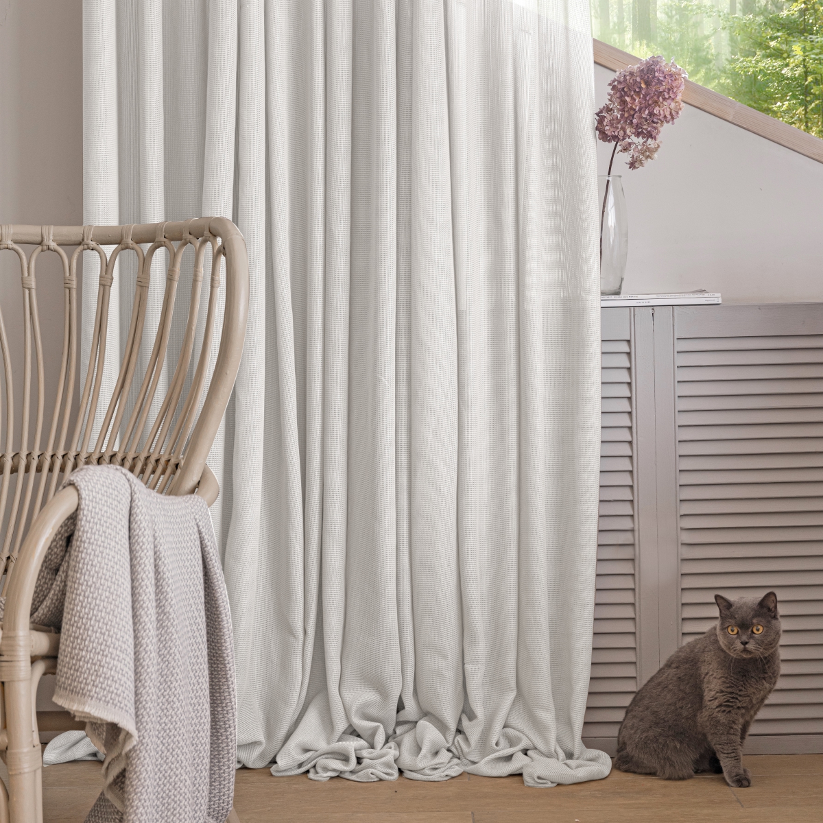 Легкая невесомая и в тоже время особо прочная, износостойкая ткань соткана в виде сетки. Натуральная фактура очень мягкая, приятная на ощупь. Прекрасно драпируется, может использоваться как самостоятельный декор окна.